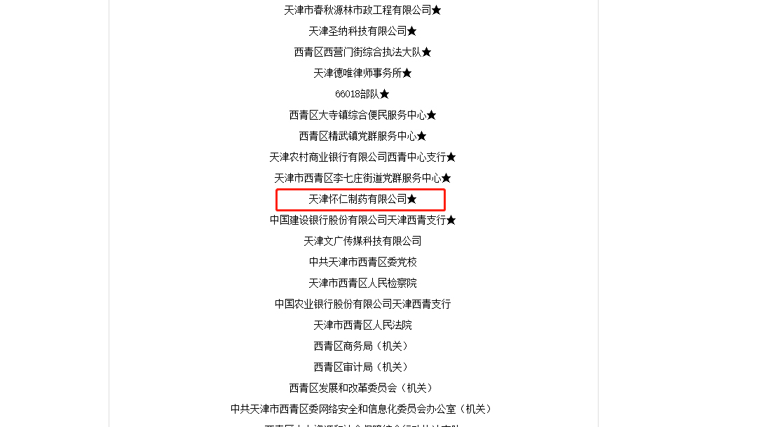 近日,天津市西青區(qū)精神文明建設委員會辦公室公示了2021-2023年度天津市西青區(qū)文明單位,天津懷仁制藥有限公司榮獲天津市西青區(qū)“文明單位”稱號!